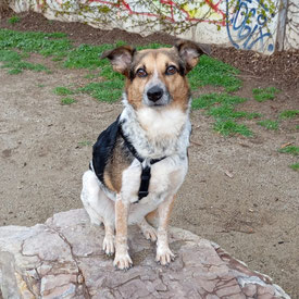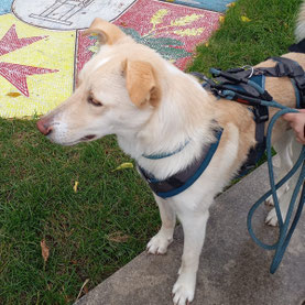 Fiona ist eher unsicher bis ängstlich und wird durch Training immer sicherer und hat gelernt sich auf ihr Frauchen zu verlassen.